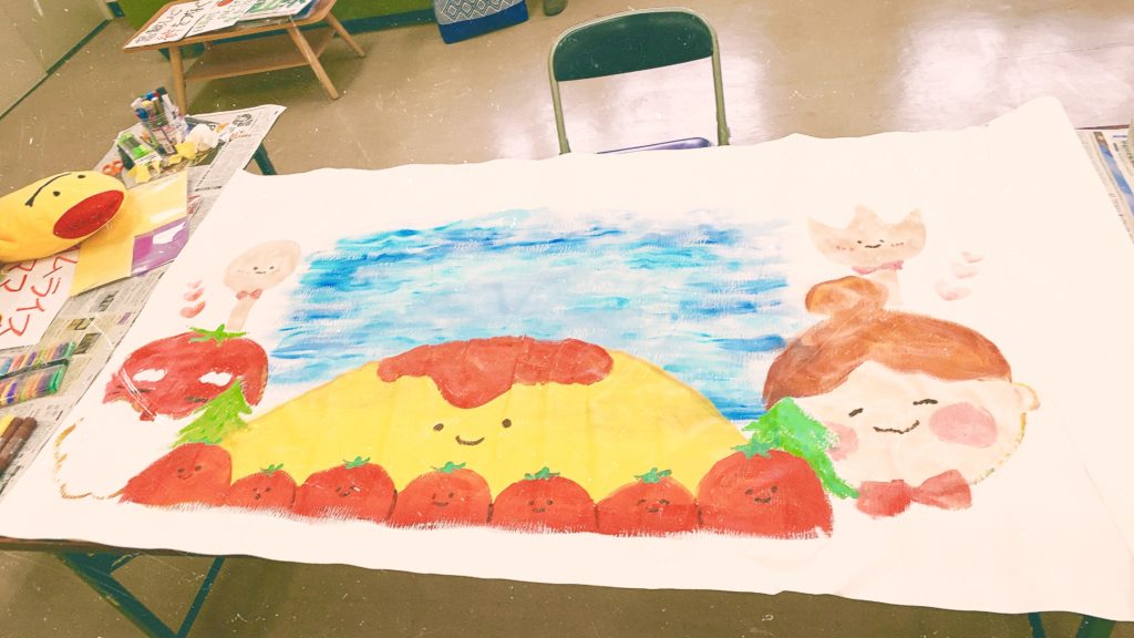 横断幕いっぱいに日高村の青空とオムライス、そしてトマトの神様を描きました!